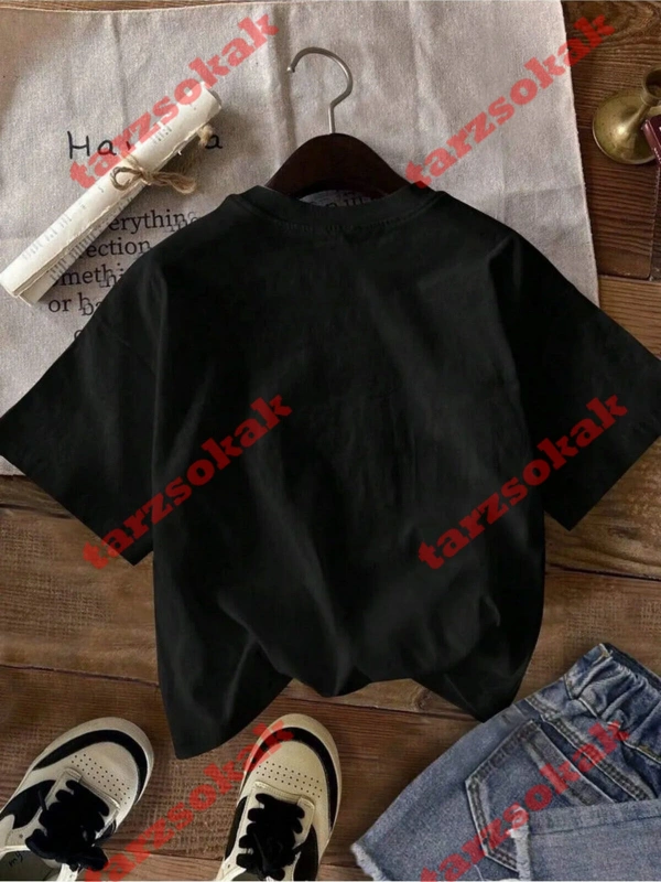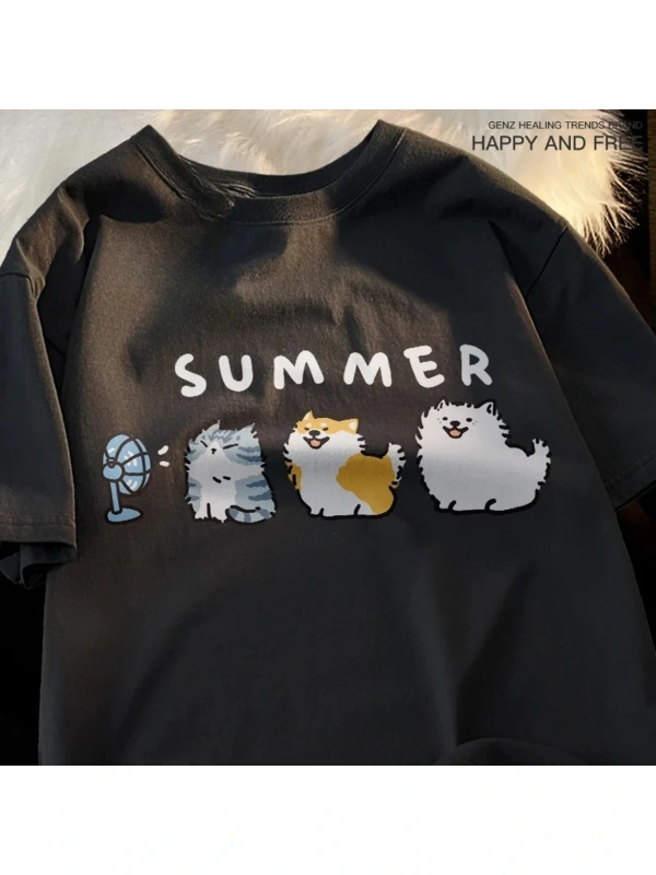 Siyah Eğlenceli ve Sevimli Kedi ve Köpek Desen Gevşek Tshirt Vintage Üst FemaleT-Shir