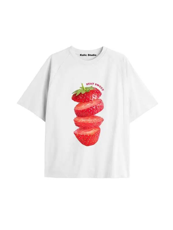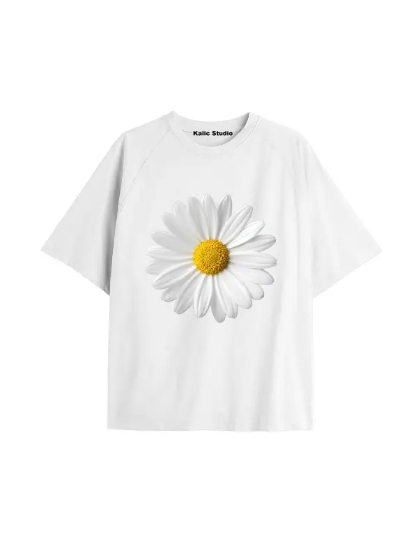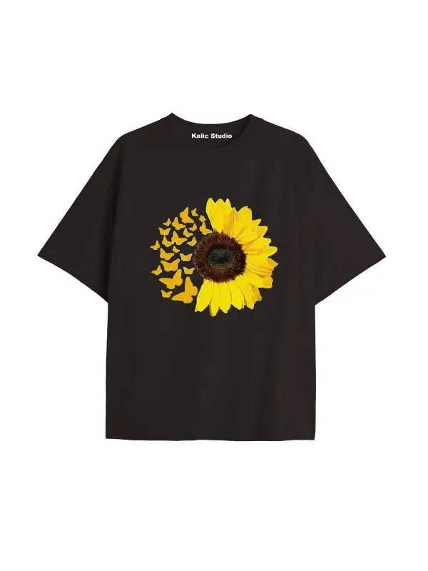 Kadın Çiçek Özel Baskılı Renkli Oversize Penye Pamuklu Bisiklet Yaka T-Shirt