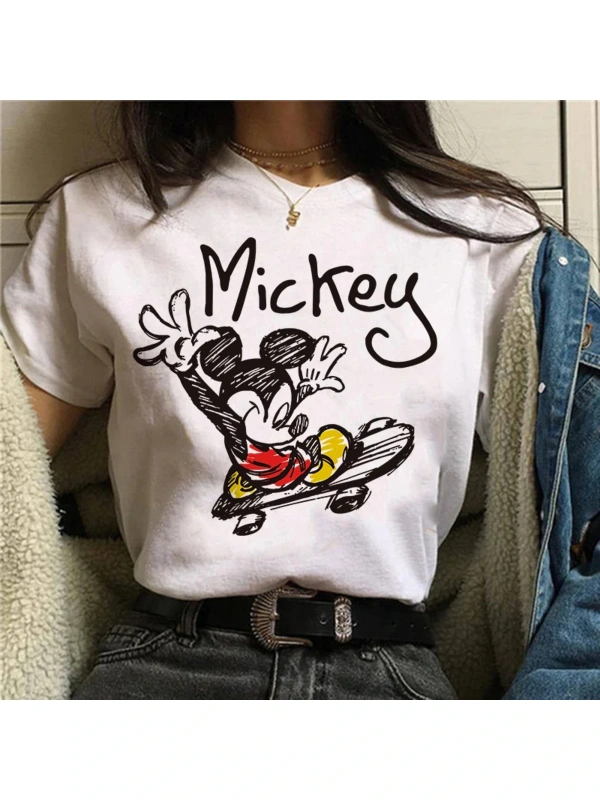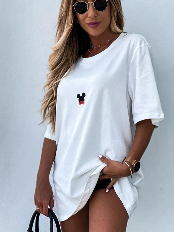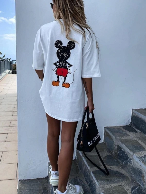 Unique----Kadın Beyaz Sırt Baskılı Mickey Mouse T-shirt