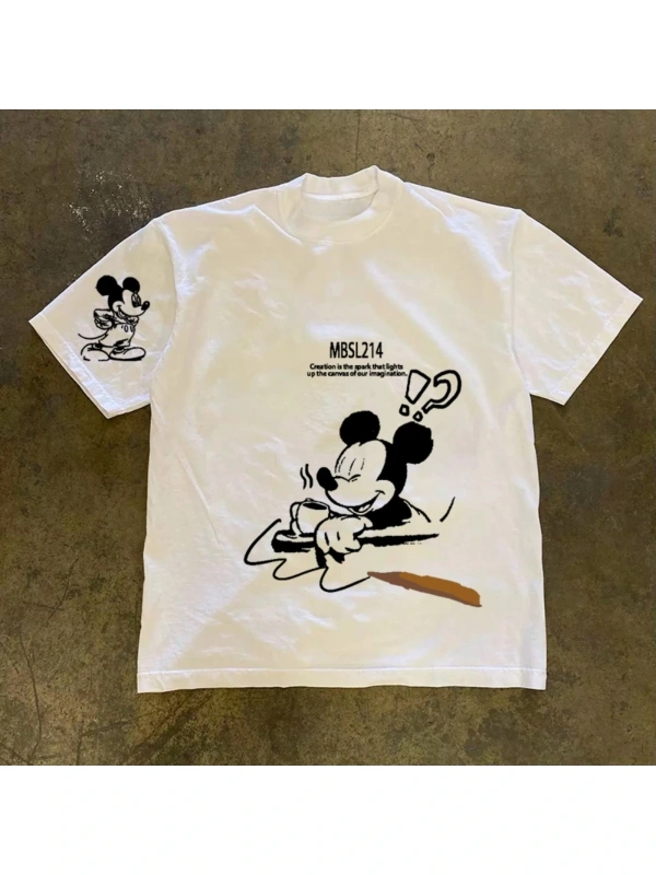Unique----Unisex Kadın Erkek Mickey Mous Özel Baskılı Oversize Pamuk Penye T-shirt Beyaz