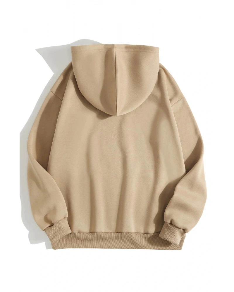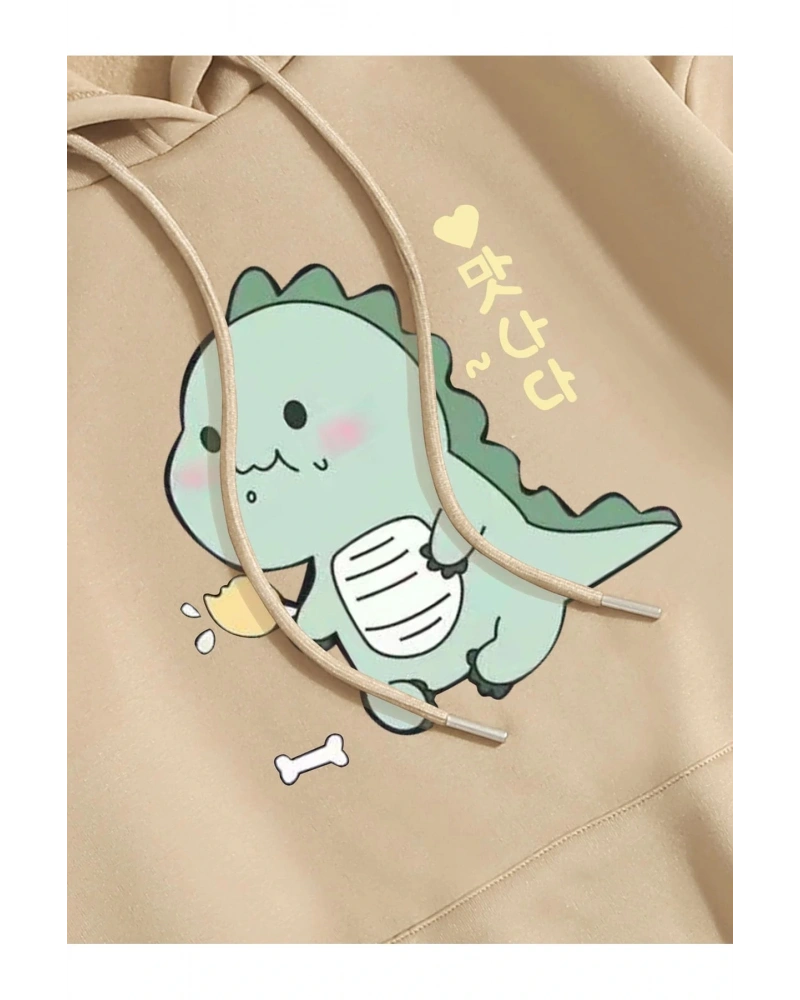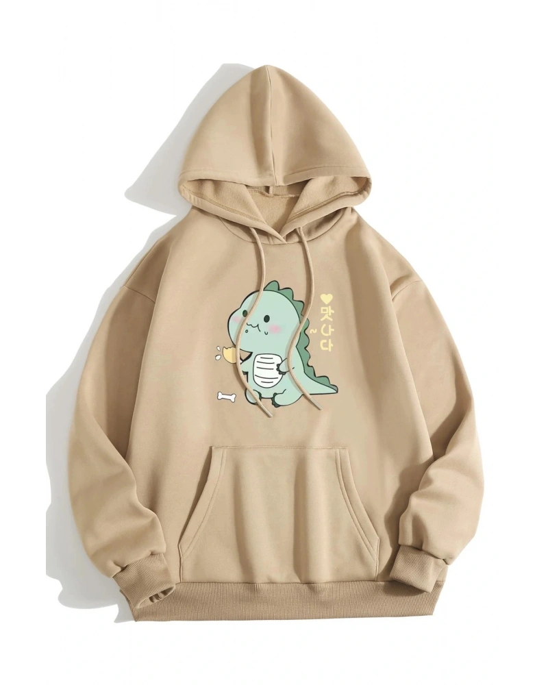 Unisex Dino Baskılı Oversize Kapüşonlu Pamuklu Sweatshirt Bej