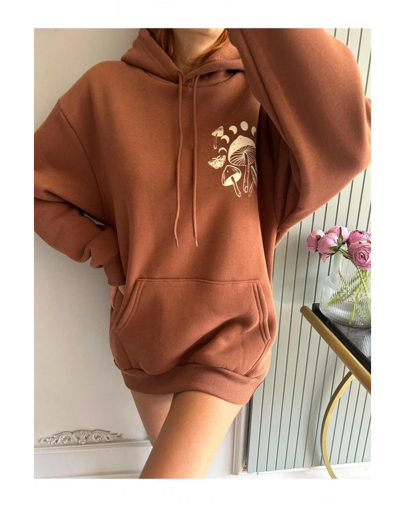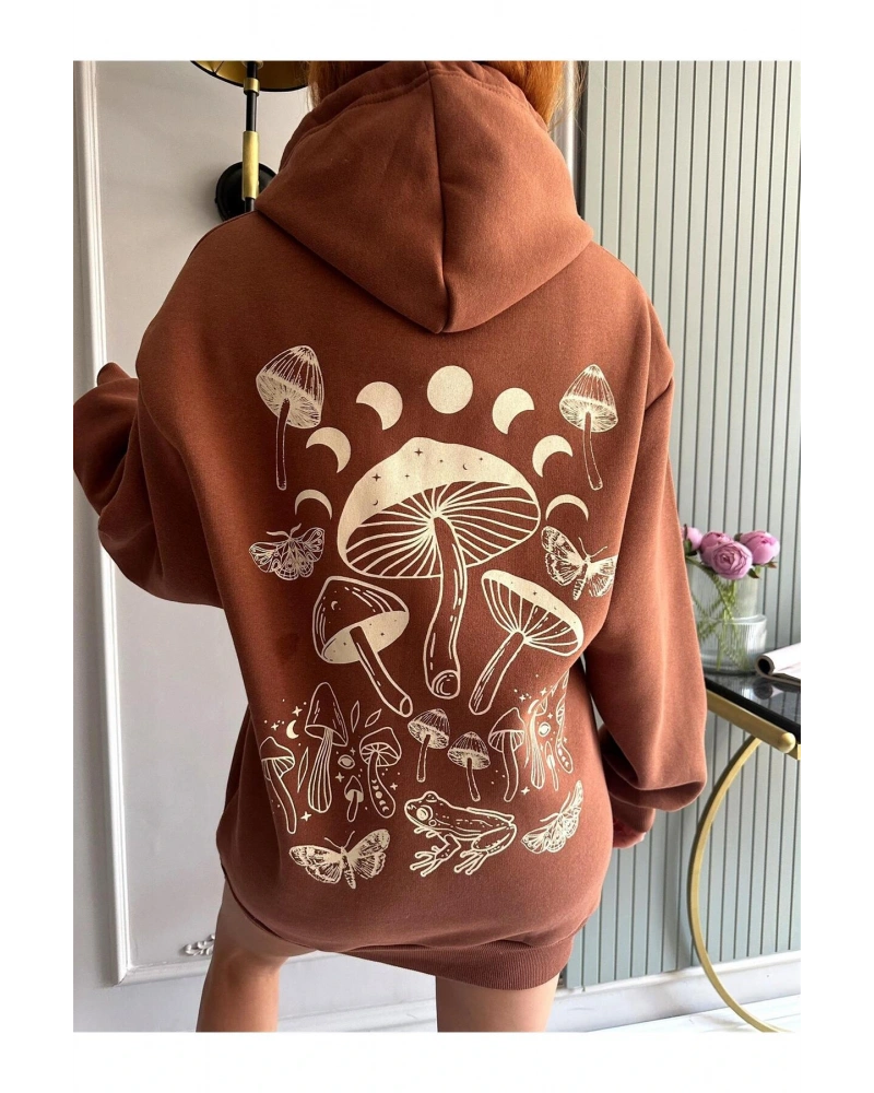 Unisex Erkek/Kadın MANTAR Renkli Özel Baskılı Oversize Kapüşonlu Sweatshirt Kahverengi