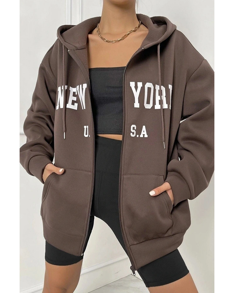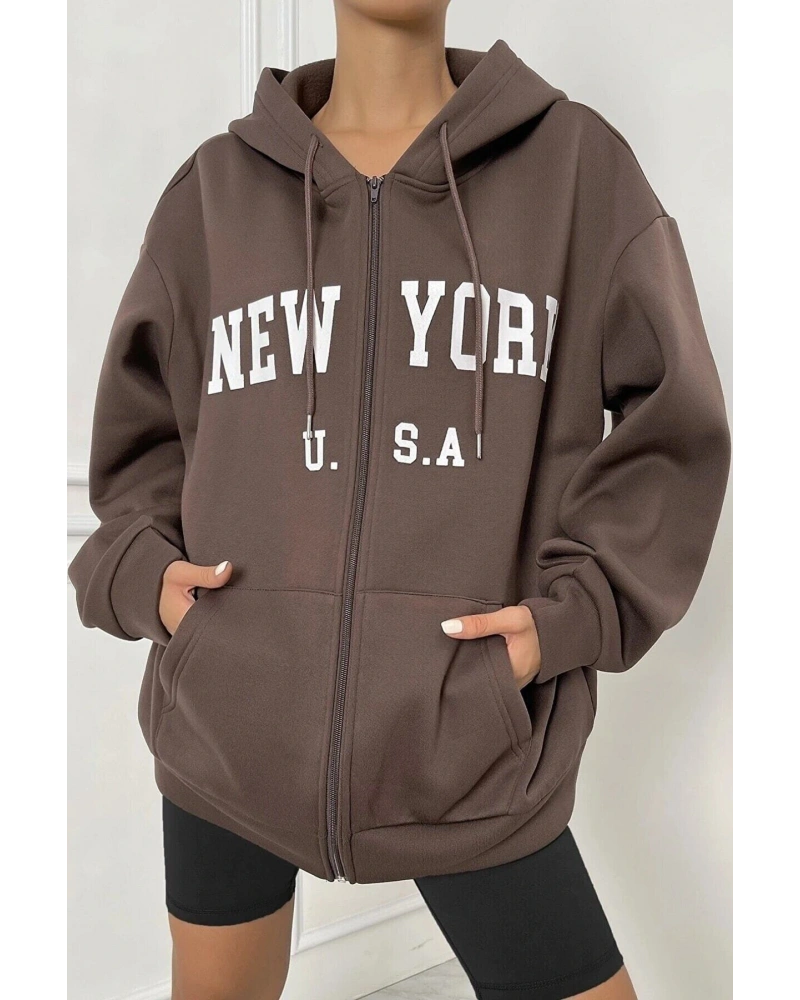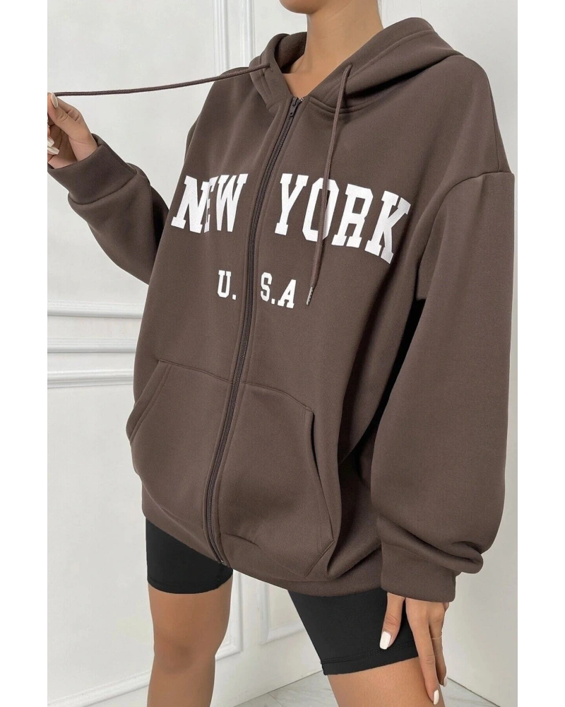 Unisex Kahverengi Newyork Baskılı Oversize Hırka newyork2022 Kahverengi