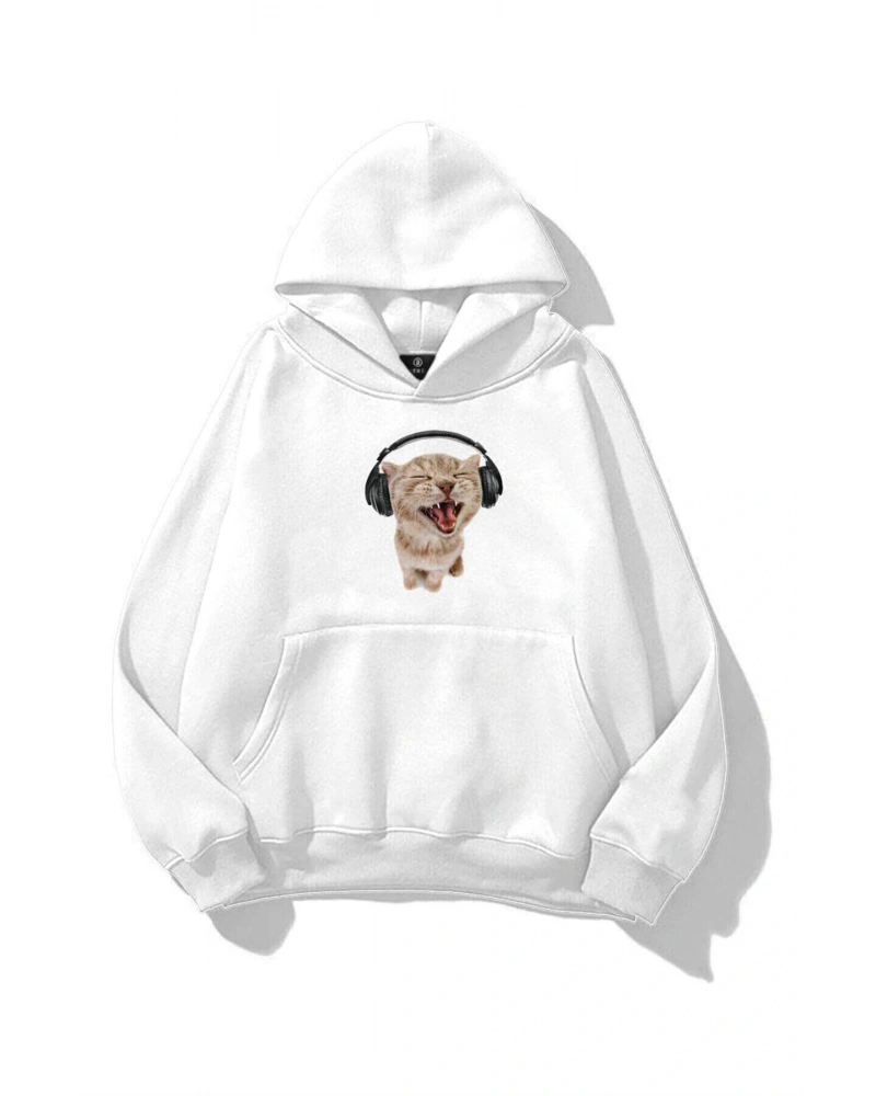 Unisex Kulaklıklı Kedi Sweatshirt Beyaz