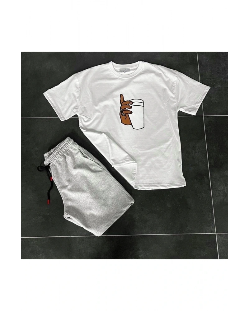 Unisex Paper Cup Baskılı Beyaz T-shirt ve Gri Şort Sporcu Kombin mdl-tkmspr-04