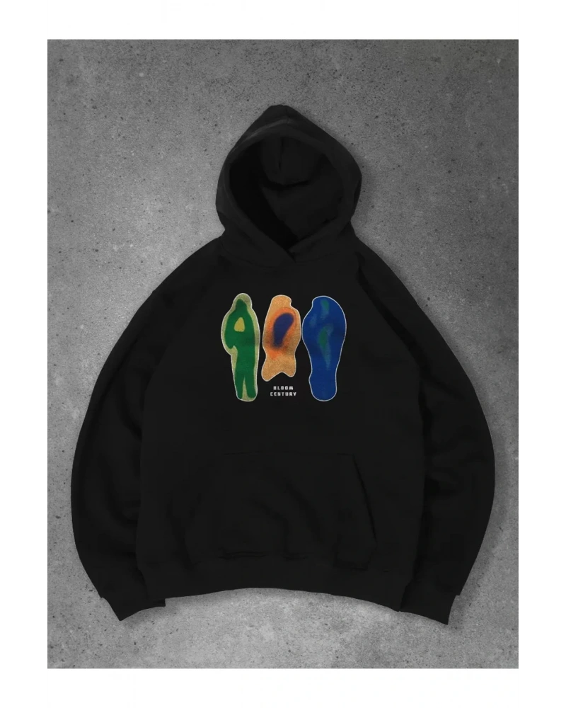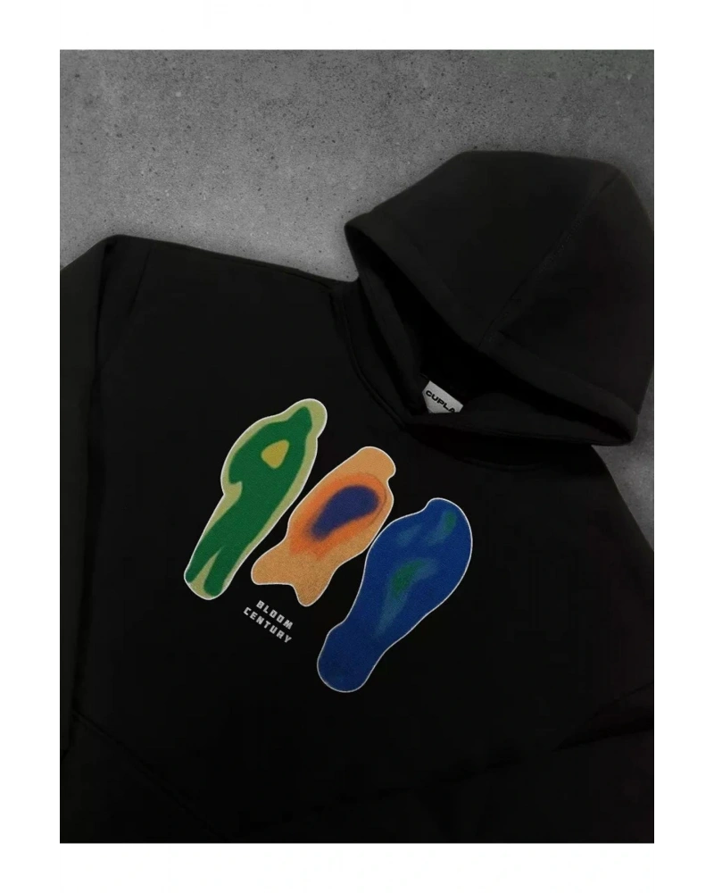 Siyah Yakasız Tüy Baskılı Unisex Sweatshirt