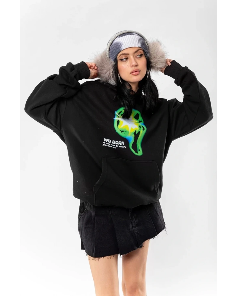 YQYQ----- Oversize Kulaklık Genç Kız Siyah Beyaz Tasarım Baskılı Unisex Kapüşonlu Sweatshirt Hoodie
