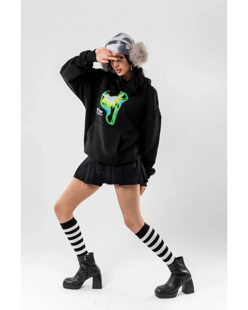 YQYQ----Oversize Powerpuff Girls Tasarım Baskılı Kapüşonlu Sweatshirt Hoodie Siyah