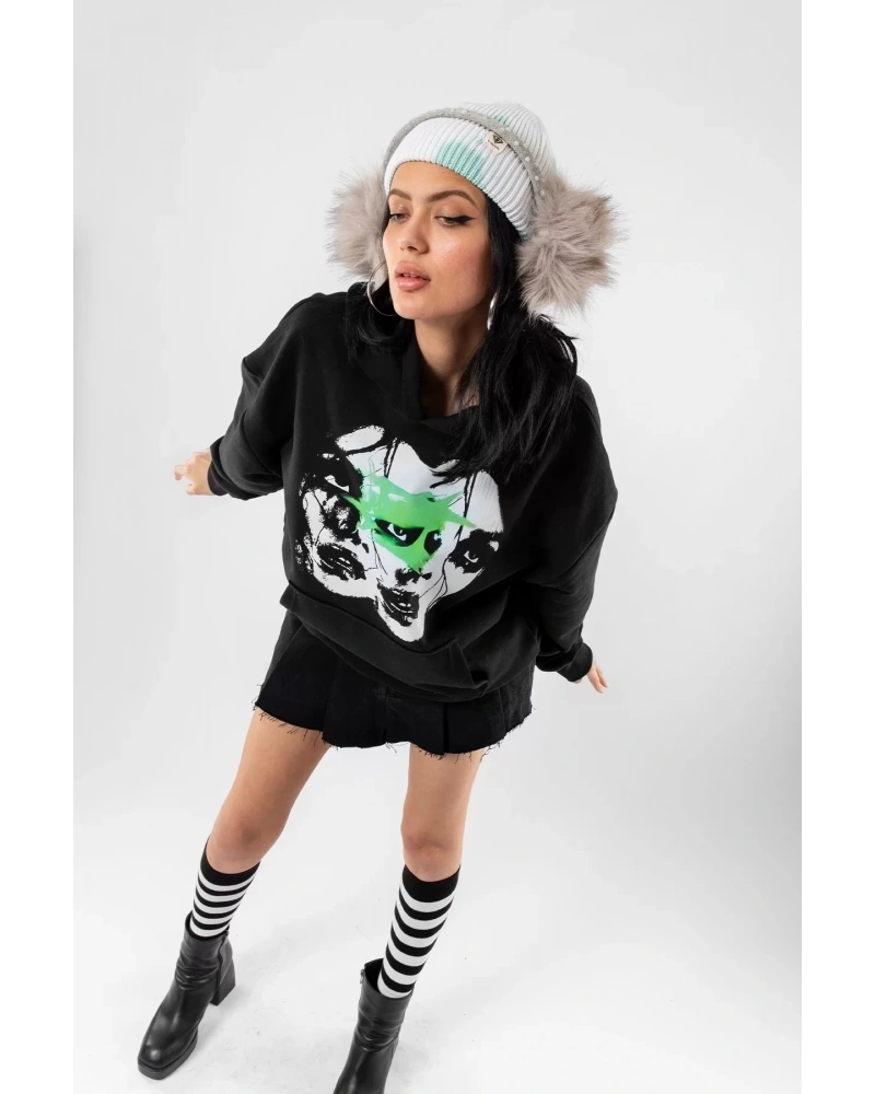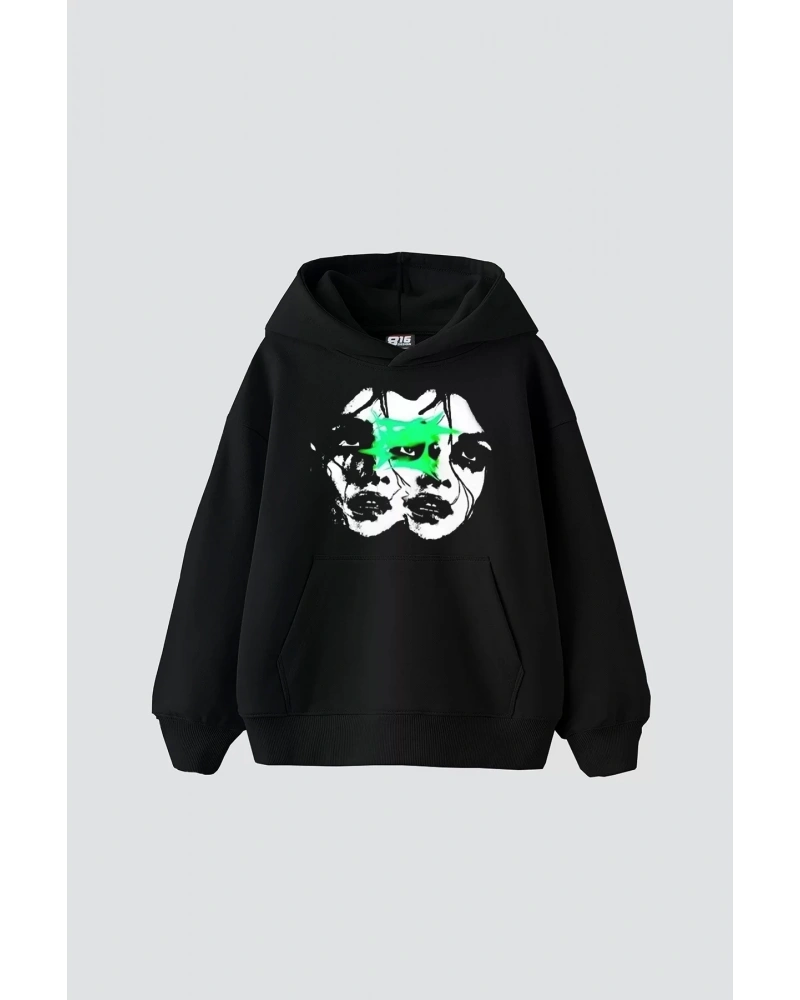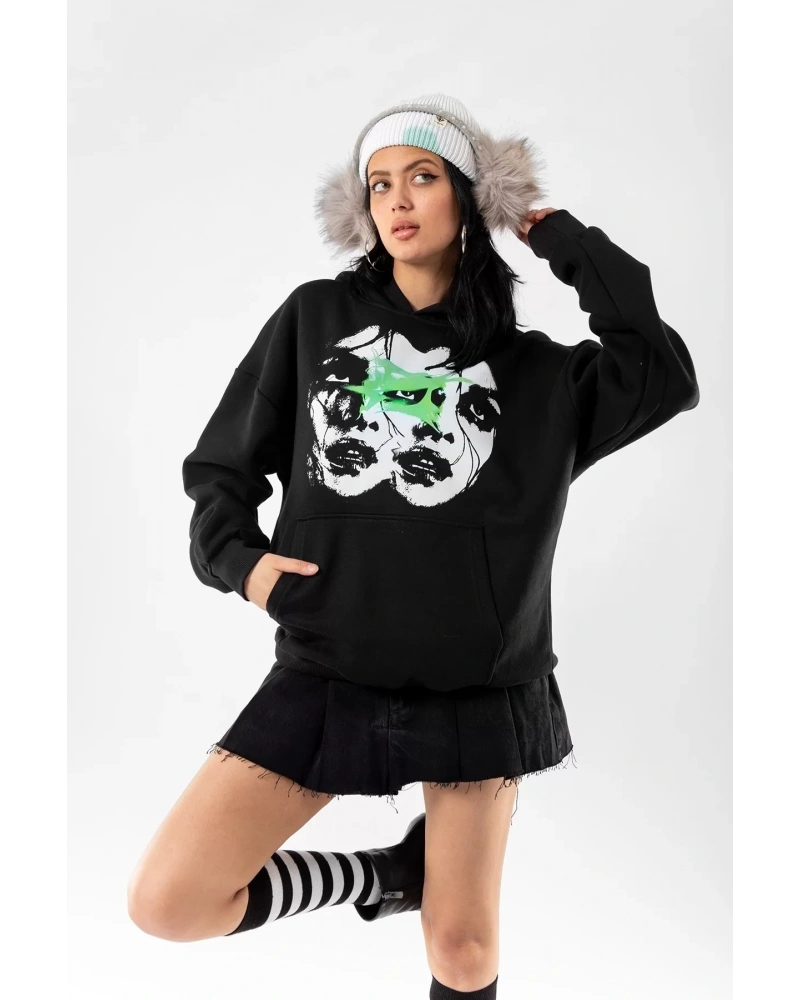 YQYQ----Oversize Powerpuff Girls Tasarım Baskılı Kapüşonlu Sweatshirt Hoodie Siyah