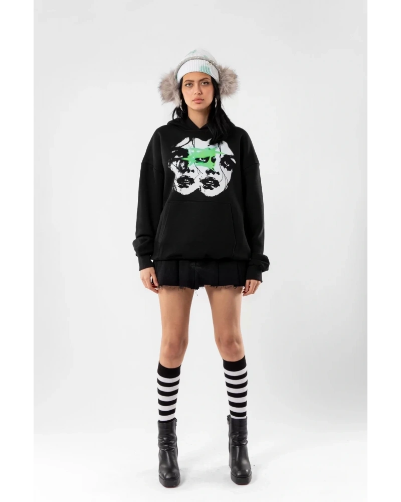YQYQ----- Oversize Kulaklık Genç Kız Siyah Beyaz Tasarım Baskılı Unisex Kapüşonlu Sweatshirt Hoodie