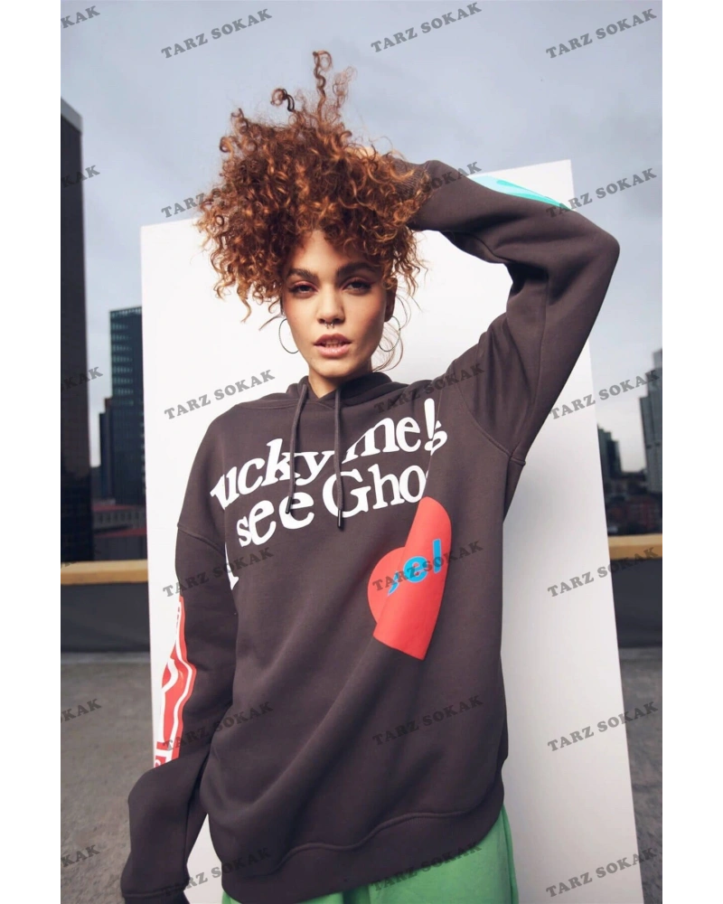 Yasolin----Kadın Gri New Rochelle Baskılı Kapüşonlu Oversize Sweatshirt