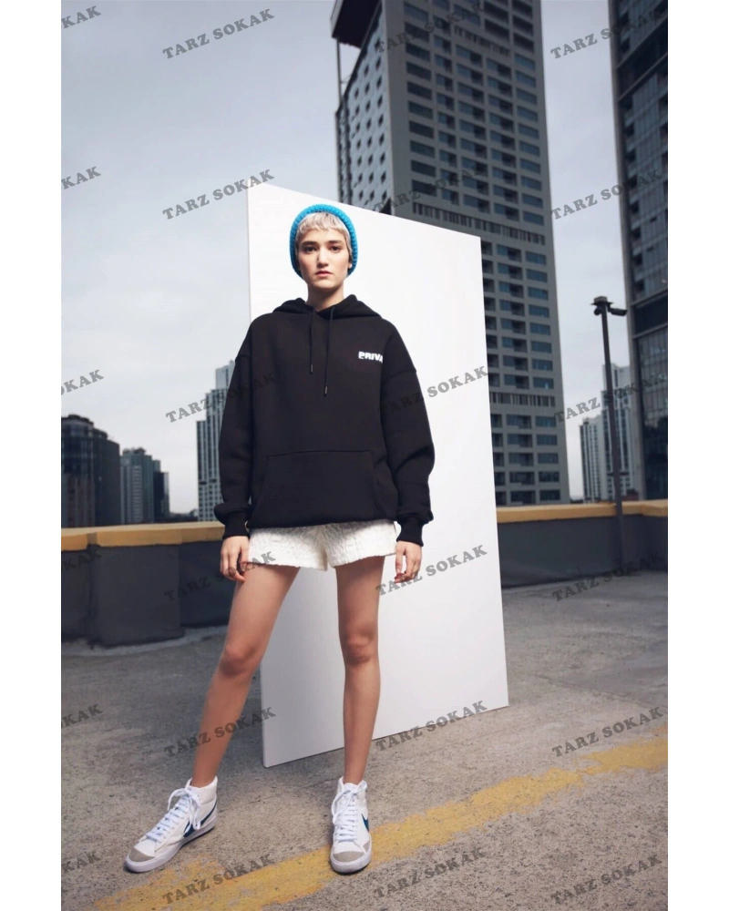 Siyah Yakasız Tüy Baskılı Unisex Sweatshirt