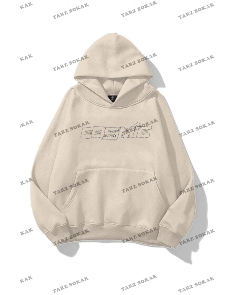 Sloganlı ve Yıldız Desenli Düşük Omuzlu Oversize Sweat Bej