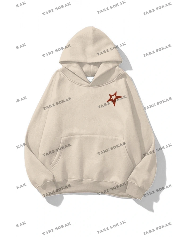 Sloganlı ve Yıldız Desenli Düşük Omuzlu Oversize Sweat Bej