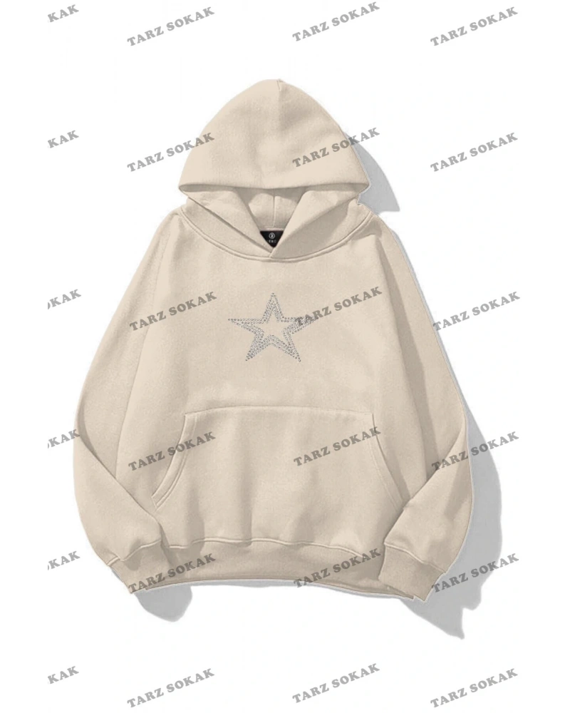 Sloganlı ve Yıldız Desenli Düşük Omuzlu Oversize Sweat Bej
