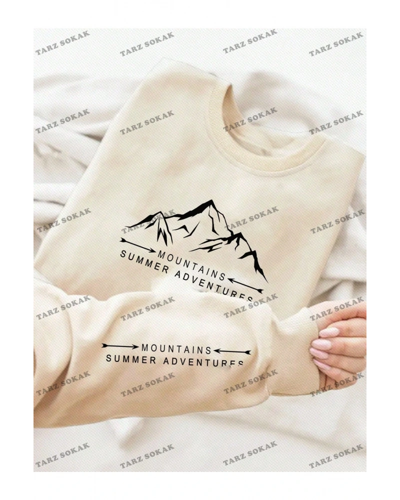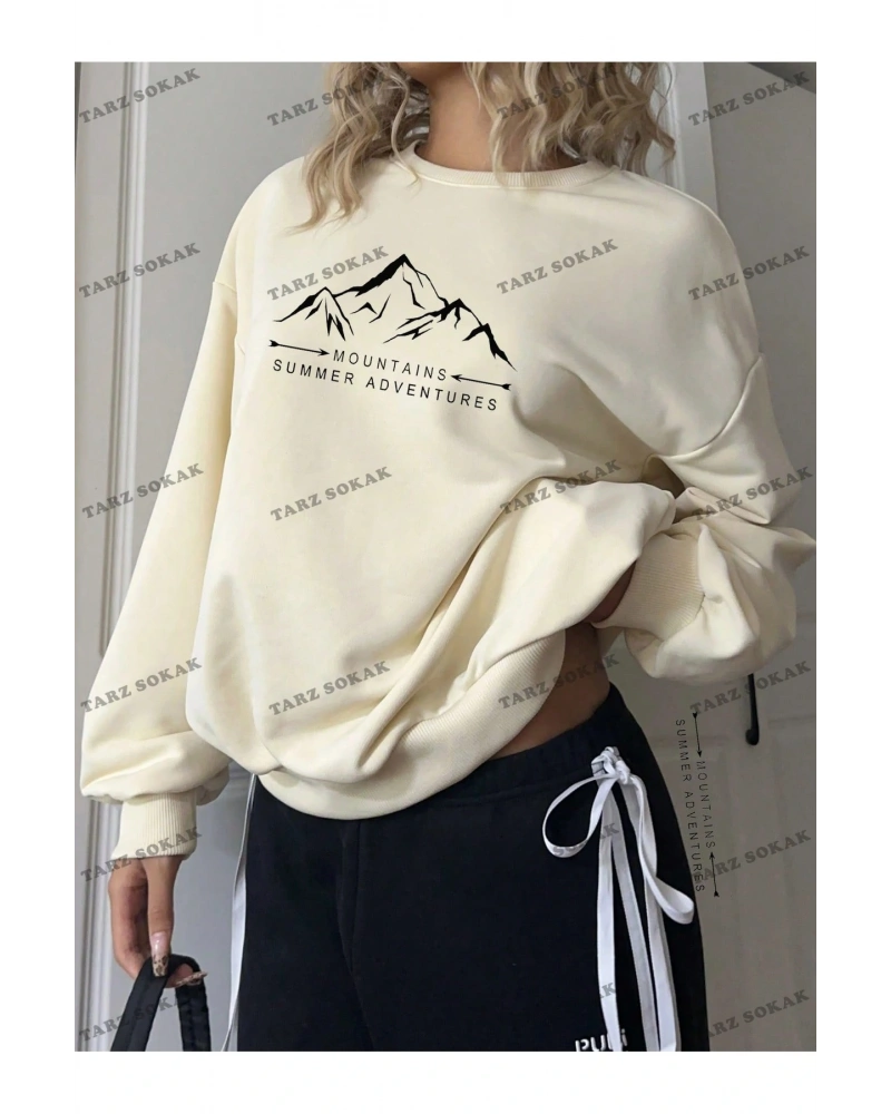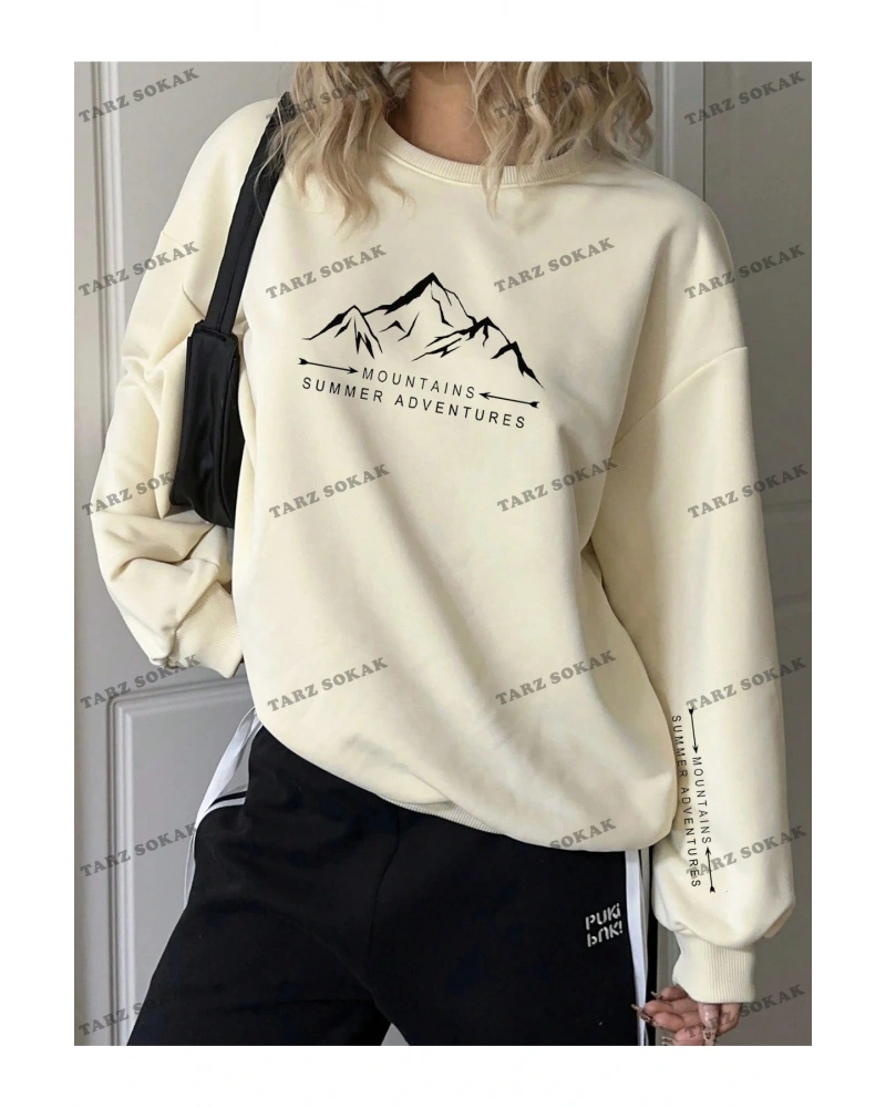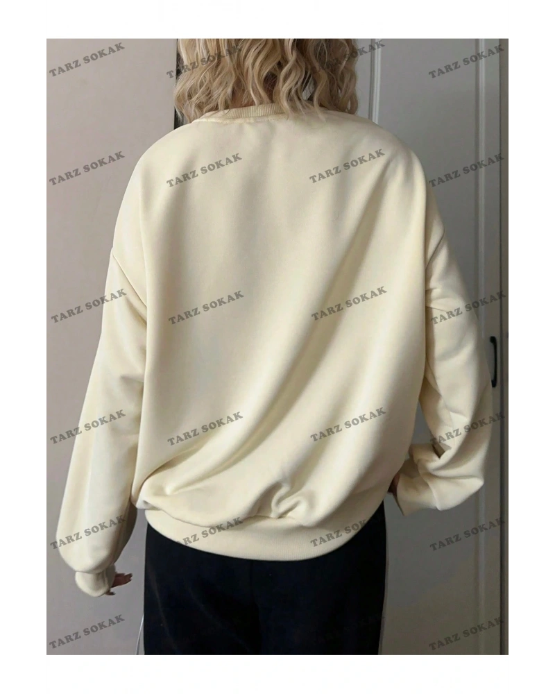 Sloganlı ve Yıldız Desenli Düşük Omuzlu Oversize Sweat Bej