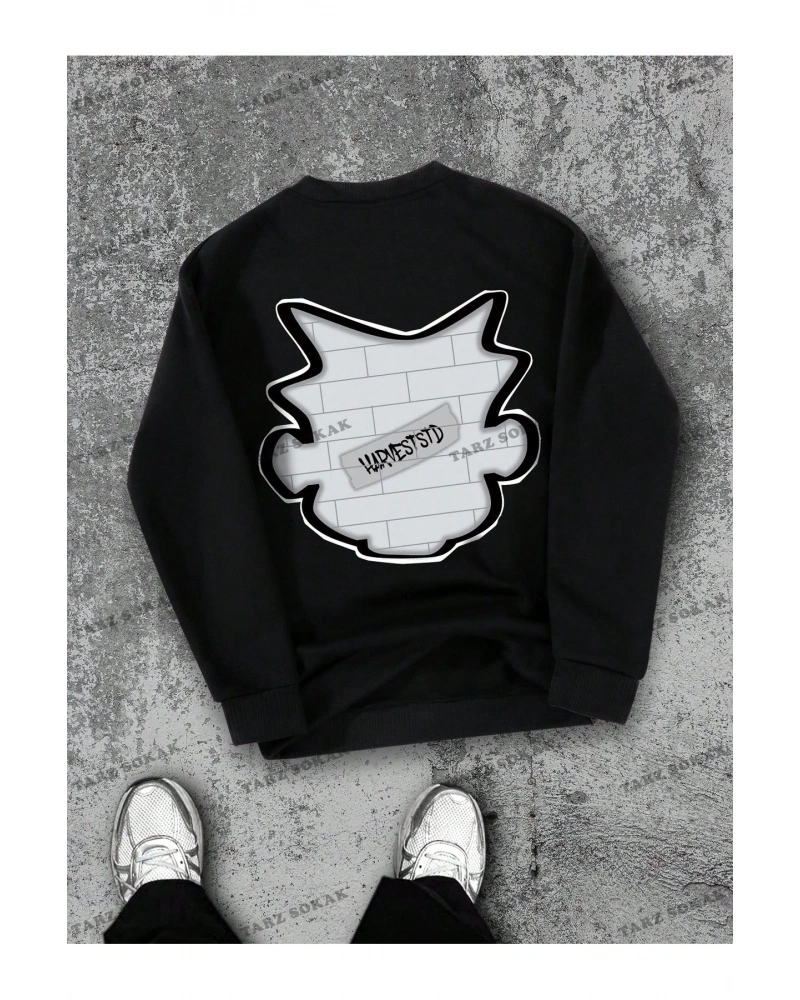 Siyah Yakasız Tüy Baskılı Unisex Sweatshirt