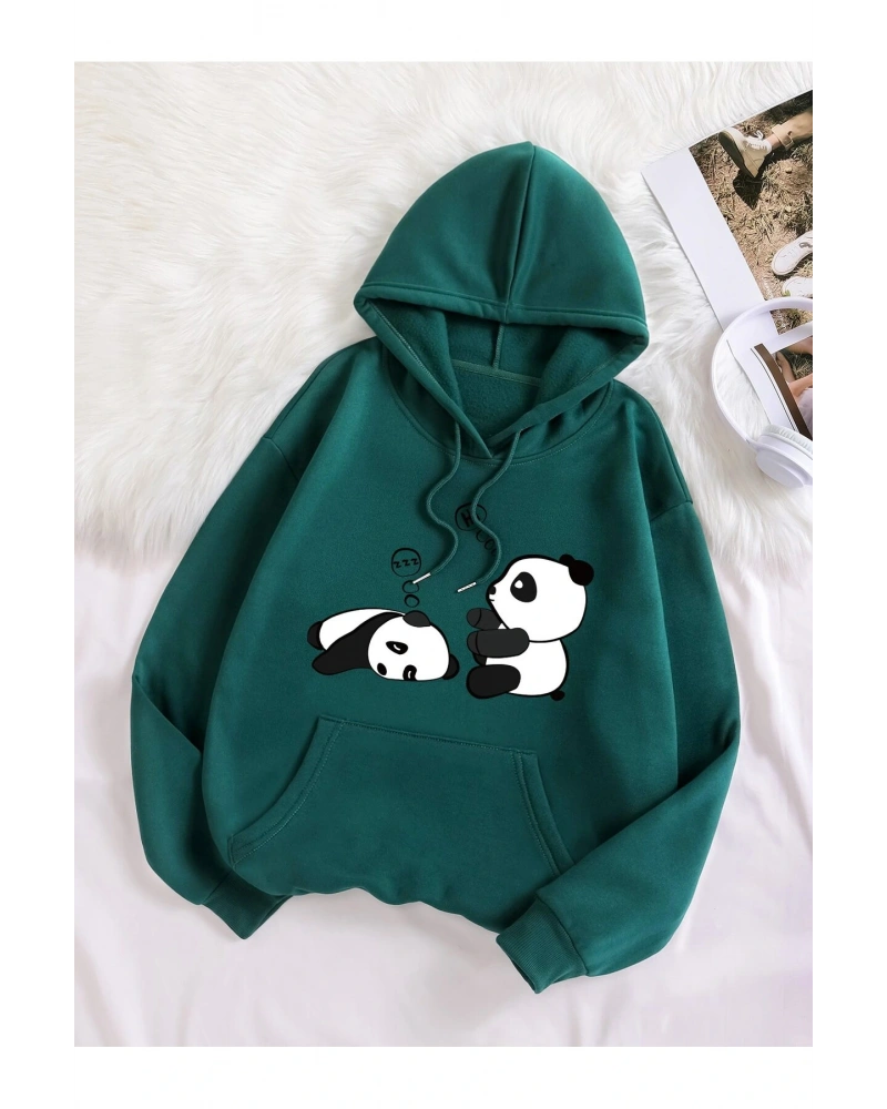 Yasolin----Haki PANDA Özel Baskılı Oversize Kapüşonlu Sweatshirt Haki