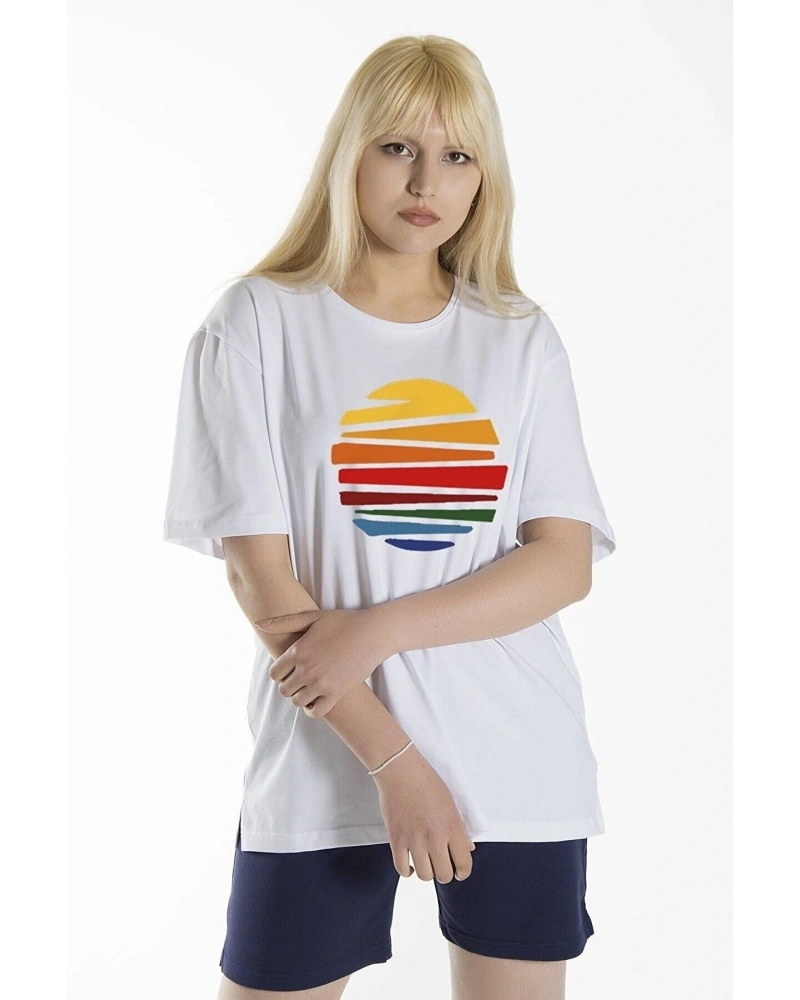 Yasolin----Kadın Beyaz Önü Güneş Baskılı Bisiklet Yaka Oversize Pamuklu T-shirt