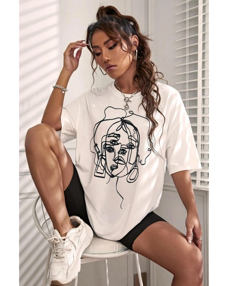 Yasolin----Kadın Beyaz Yüz Baskı Detaylı Oversize T-shirt