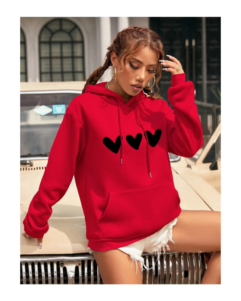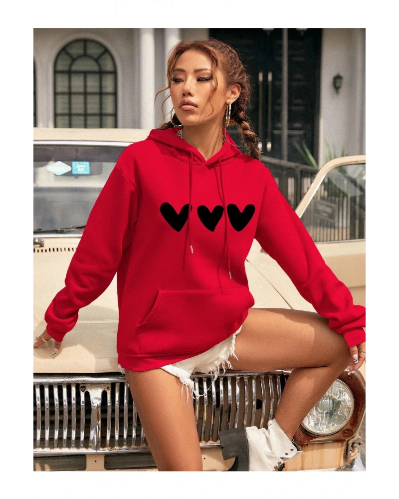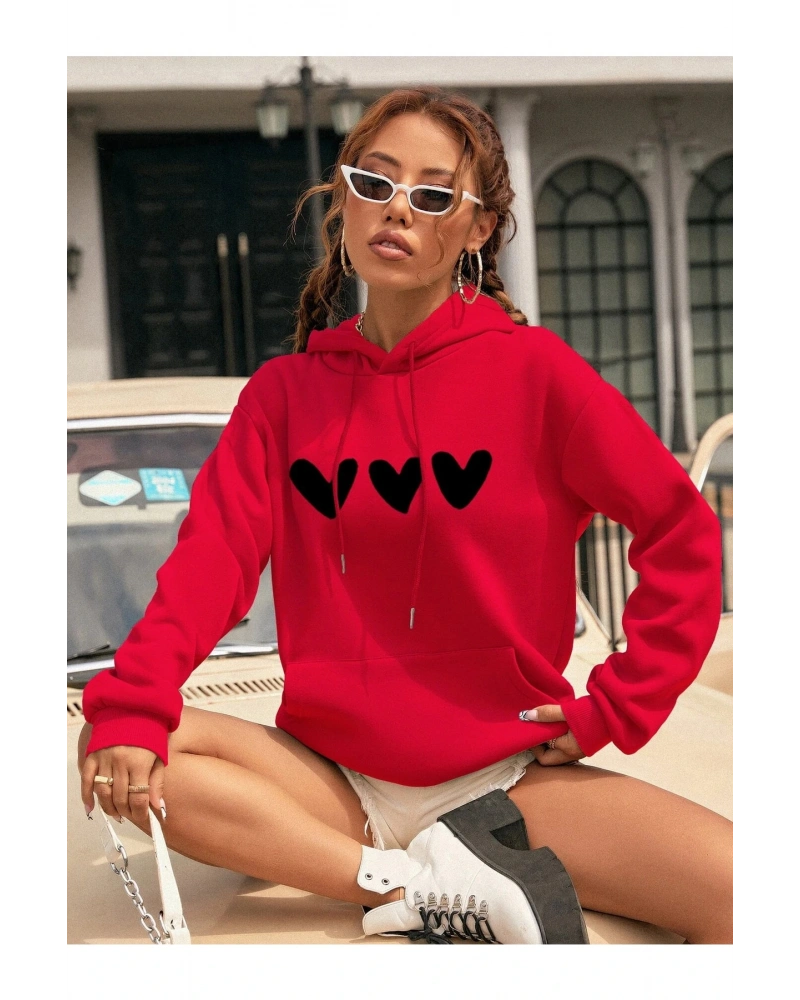 Yasolin----Kadın Kalp Baskılı Kapüşonlu Sweatshirt Kırmızı