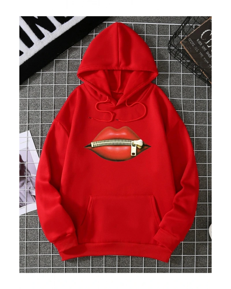 Yasolin----Kadın Kırmızı Lips Baskılı Kapüşonlu Sweatshirt