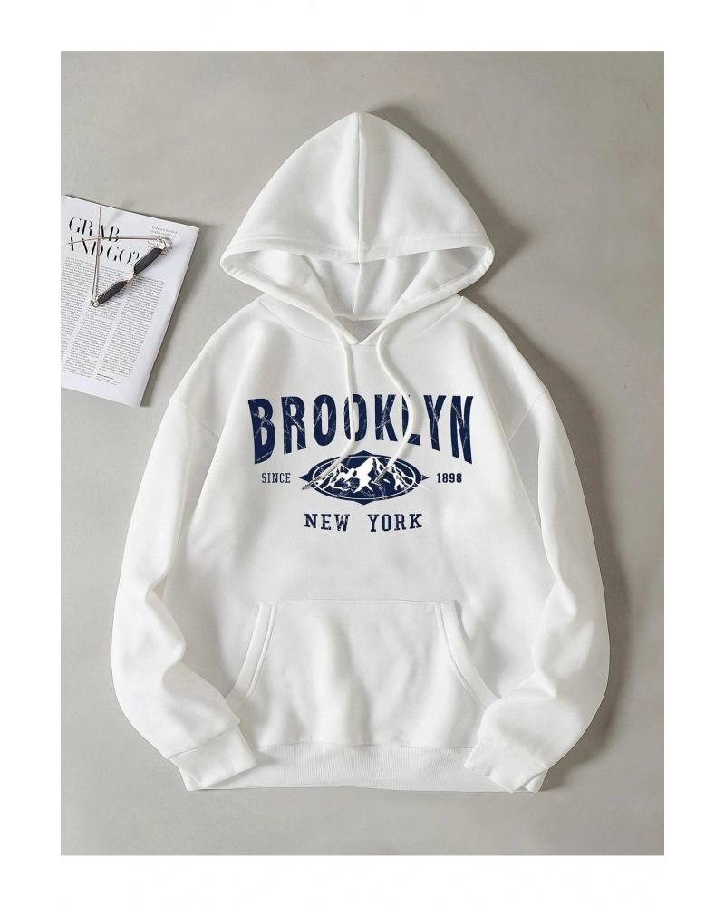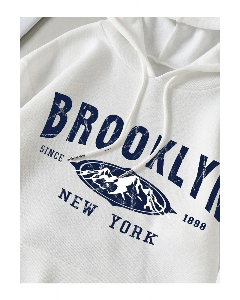 Yasolin----Unisex Beyaz Brooklyn Baskılı Kapüşonlu Sweatshirt