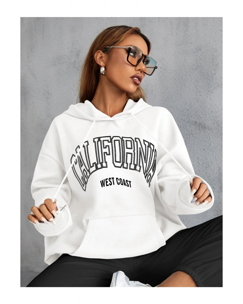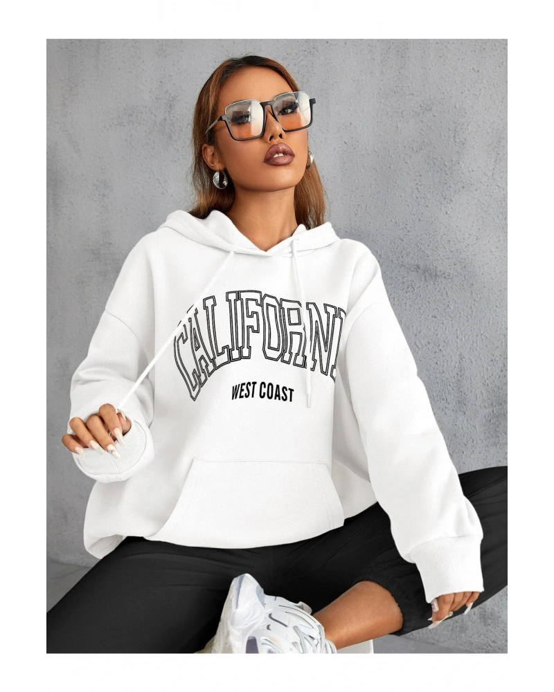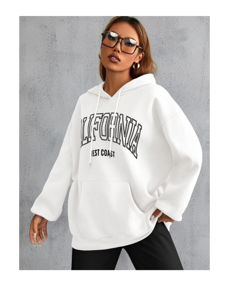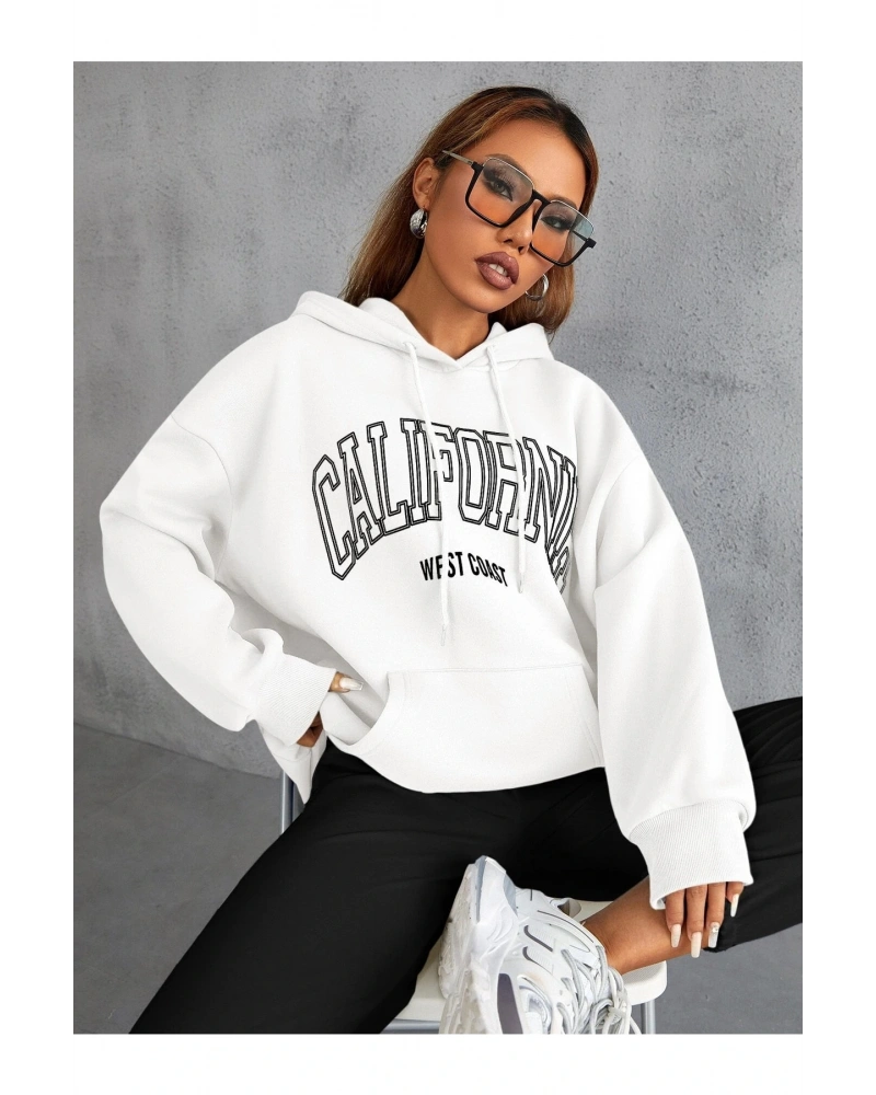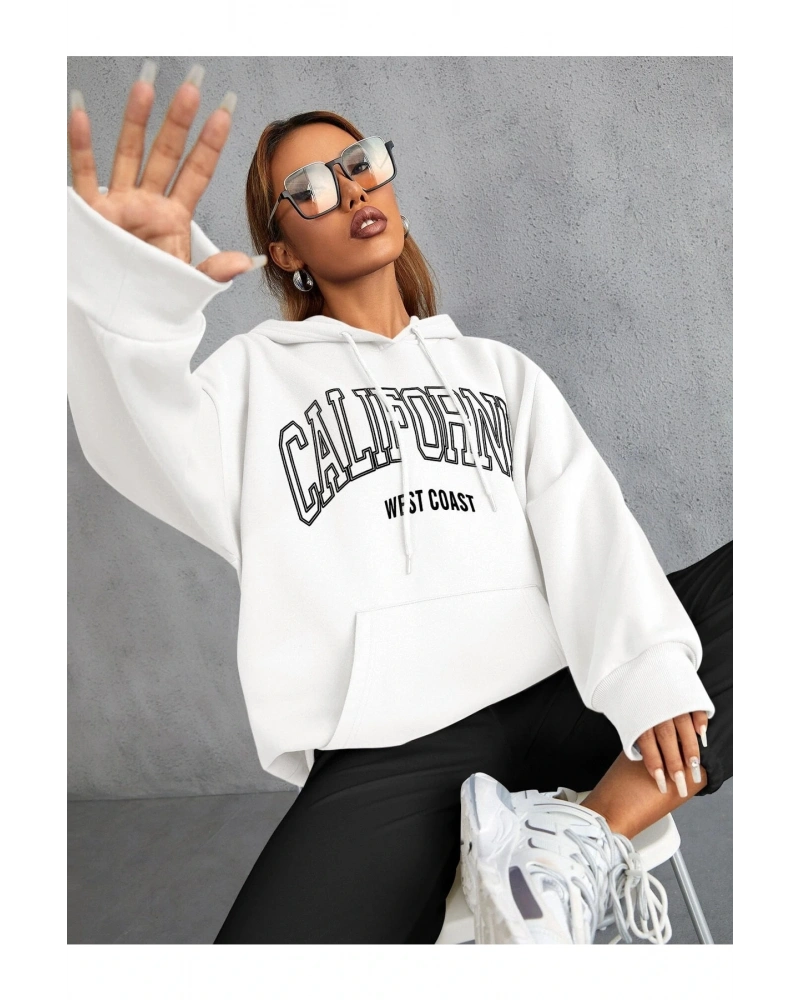 Yasolin----Unisex Calıfornia Baskılı Kapüşonlu Sweatshirt Beyaz
