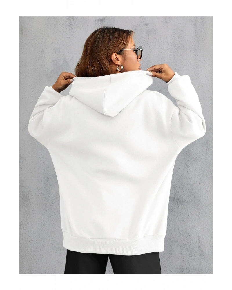 YQYQ----Oversize Sevimli Panda Cep Tasarımlı Baskılı Kapüşonlu Sweatshirt Hoodie Beyaz