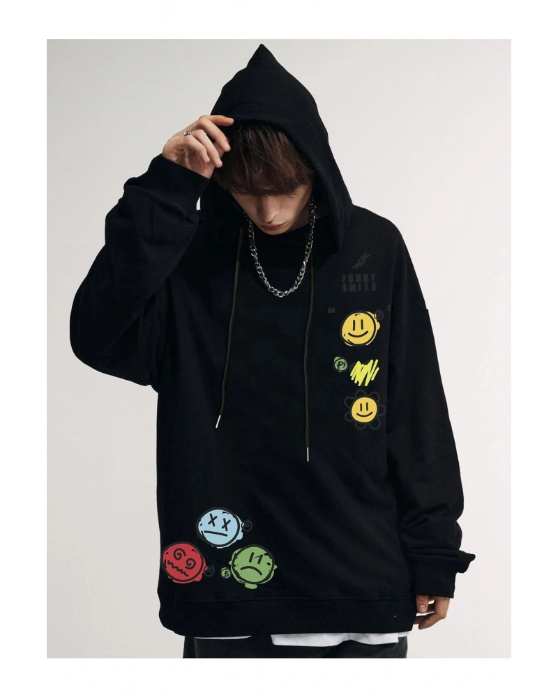 Yasolin----Unisex Emoji Özel Baskılı Kapüşonlu Oversize Sweatshirt Siyah