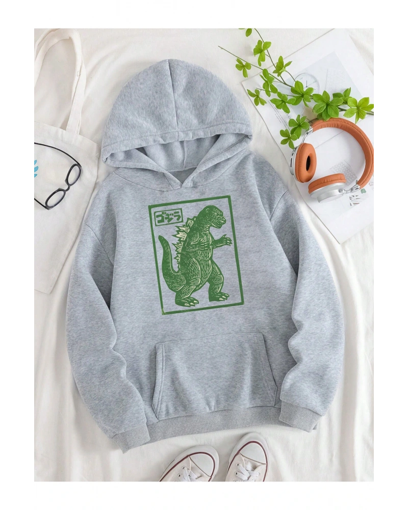 Yasolin----Unisex Oversize Kapüşonlu Kanguru Cepli Goodzila Baskılı Gri