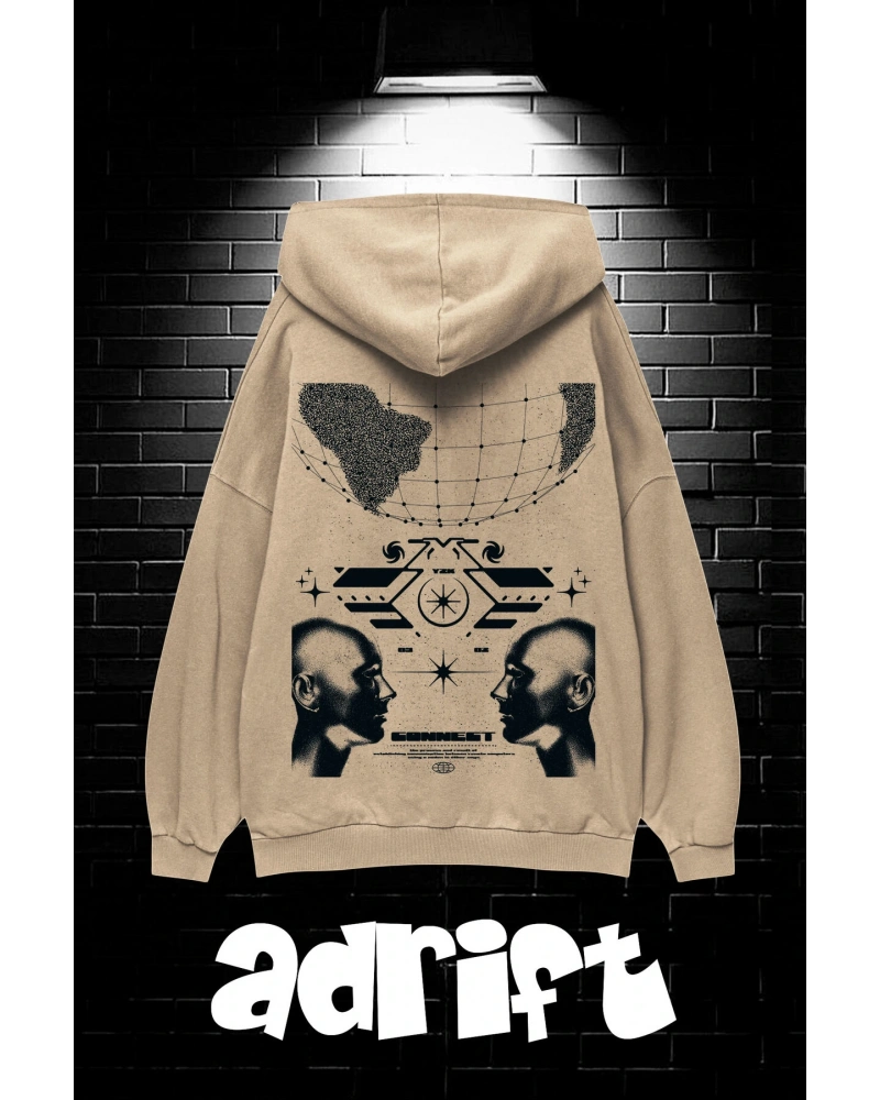 Yasolin----Unisex Oversize Kapüşonlu Kanguru Cepli Resro Futurısm Baskılı Sweatshirt Hoodie Bej