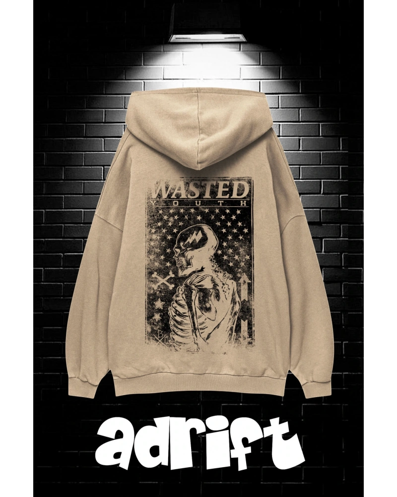 Yasolin----Unisex Oversize Kapüşonlu Kanguru Cepli Wasted Baskılı Sweatshirt Hoodie Bej