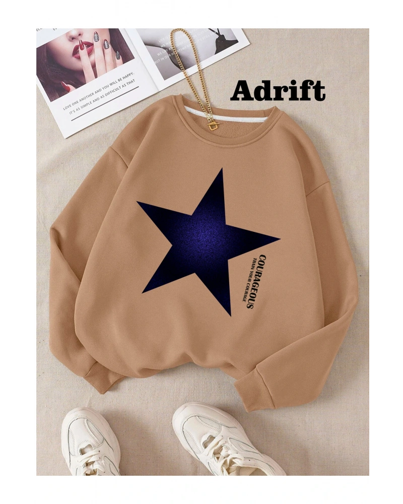 Sloganlı ve Yıldız Desenli Düşük Omuzlu Oversize Sweat Bej